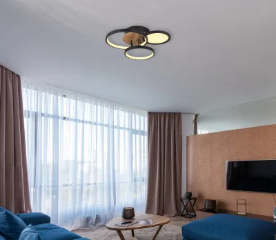 Ova divna plafonska lampa iz serije SID inspiriše sjajnim dizajnom. Od okruglog plafonskog nosača koji je u mat crnoj boji sa prelepom dekoracijom drvenog izgleda isturena su tri okrugla svetlosna elementa u različitim veličinama (40x38x10.5cm) svaki sa integrisanim LED panelima koje emituju toplo belu svetlost od 3000 Kelvina i tako obezbeđuju prijatnu atmosferu.