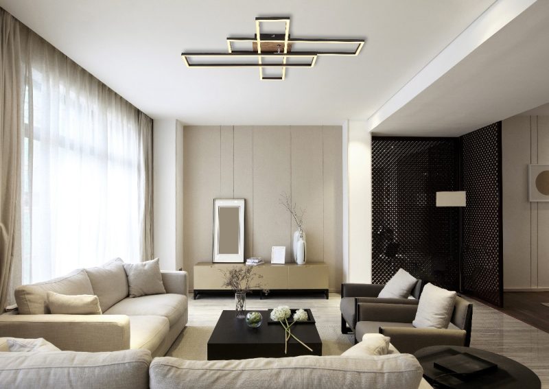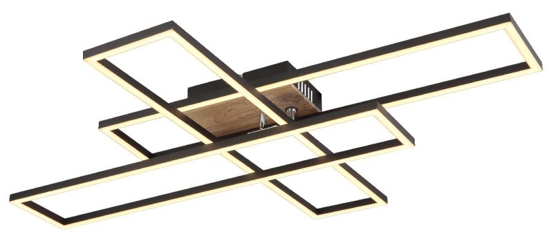 Izdužena plafonska lampa, impresionira svojim modernim i elegantnim dizajnom. Sa tri pravougaonika raspoređena jedan na drugom, od kojih se jedan može rotirati, postavlja stilske akcente u prostoriji. Telo izrađeno od crnog mat metala u kombinaciji sa tamnim izgledom drveta daje lampi plemenit izgled. Abazur napravljen od crnog mat aluminijuma i opal plastike, što osigurava prijatnu distribuciju svetlosti. Sa dimenzijama od 800 mm dužine i 600 mm širine i snagom od 40W, ovo plafonsko svetlo nudi izlaz od 1650-4230 lumena. Temperatura tople bele boje od 3000K stvara prijatnu atmosferu i idealna je za dnevne i spavaće sobe.