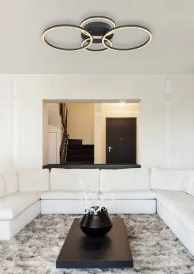 Crna mat LED plafonska lampa (Ø prstenja: 2x30cm, 2×20,5cm) privlači svačiju pažnju svojim modernim, impozantnim dizajnom. Njegov zakrivljeni oblik stvara pravi detalj koji će privlačiti pažnju. Moderna plafonska lampa je snabdevena sa tri trajno postavljene LED sijalice. Zahvaljujući LED tehnologiji koja se koristi, lampa izuzetno štedi energiju i ističe se se sa niskom proizvodnjom toplote i dugim radnim vekom.