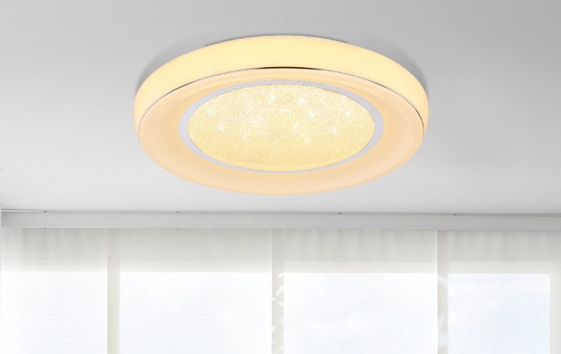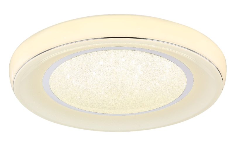 Plafonska lampa iz serije MICKEY ističe se svojim modernim izgledom. Okrugli abažur (Ø66cm) pruža uzbudljivo svetlo sa svetlucavim kristalima unutar njega. Pomoću daljinskog upravljača možete lako zatamniti svetlo ( max. 1950 lumena) i postepeno podešavati i fiksirati boju svetlosti od toplo bele 3000K do hladno bele 6000K.