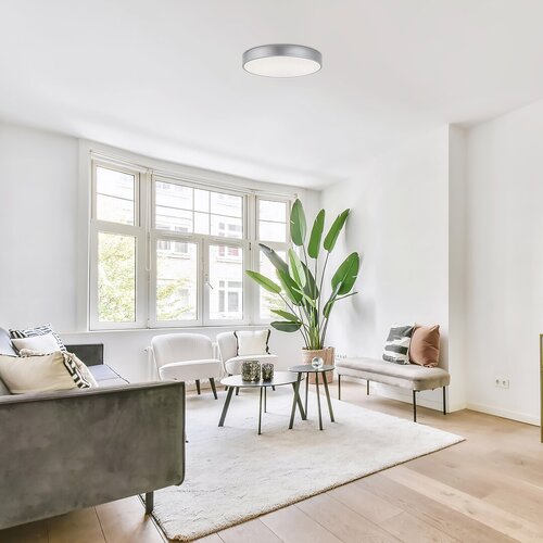 Moderna, okrugla Octav 2 plafonska lampa je dobar izbor za dnevnu sobu, spavaću sobu ili radnu sobu. Ovaj model karakteriše jednostavan, čist dizajn i ima srebrnu boju i beli plastični abažur sa zvezdanim efektom. Velika plafonska lampa ima ugrađen LED izvor svetlosti energetske klase G snage 24 V, svetlosnog toka od 1.200 lumena sa senkom i 2.400 lumena bez senke. Temperatura boje izvora svetlosti je 4.000 K, odnosno zrači prirodno belo svetlo, pa je ovaj model idealan izbor ako želite da postignete čist, moderan efekat u prostoriji. Octav 2 se posebno preporučuje onima koji žele da izaberu plafonsko svetlo sa dugim vekom trajanja: ovaj model obezbeđuje osvetljenje prostorije ne manje od 50.000 sati, tako da možete zaboraviti na zamenu lampe na dugi niz godina. Prečnik Octav 2 je 400 mm, rastojanje od plafona je samo 50 mm.