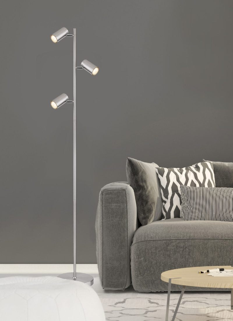 Ova podna lampa od 154 cm iz serije ROBBY je divan dodatak vašem enterijeru. Podna lampa, napravljena od nikl-mat metala, sastoji se od okrugle metalne podloge na koju je fiksirana šipka sa tri pokretna GU10 grla obložena metalom. Ona mogu biti opremljene LED sijalicama po vašem izboru, što vam pruža mogućnost da pojedinačno odredite laganu boju i jačinu. Takođe ima prekidač sa kojim se lampa može zgodno uključiti i isključiti. Sa ostalim modelima iste serije možete upotpuniti celokupnu sliku u svoja četiri zida.