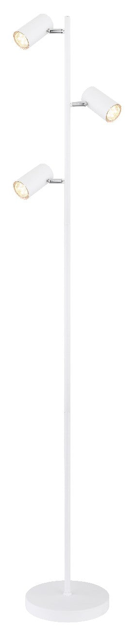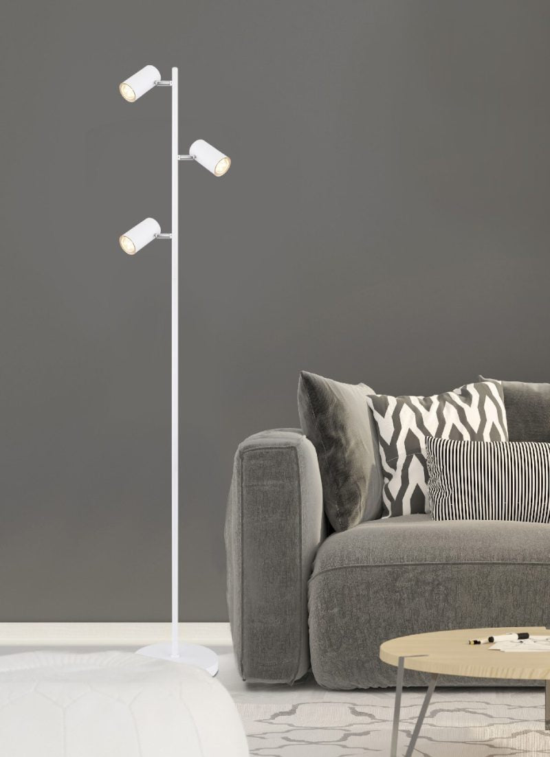 Ova podna lampa od 154 cm iz serije ROBBY je divan dodatak vašem enterijeru. Podna lampa, napravljena od belog metala, sastoji se od okrugle metalne podloge na koju je fiksirana šipka sa tri pokretna GU10 grla obložene metalom. Ona mogu biti opremljene LED sijalicama po vašem izboru, što vam pruža mogućnost da pojedinačno odredite laganu boju i jačinu. Takođe ima prekidač sa kojim se lampa može zgodno uključiti i isključiti. Sa ostalim modelima iste serije možete upotpuniti celokupnu sliku u svoja četiri zida.