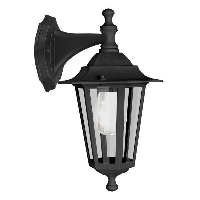 The (hanging) lantern-style LATERNA 4 exterior wall light has a black cast aluminium body with clear glass panes. The product is suitable for outdoor use due to its IP44 protection against spray water and, with its classic design, blends into outdoor spaces in a wide range of styles. This exterior wall light provides lighting that suits settings such as traditional-style or art nouveau city villas – the perfect wall light for house entrances, terraces or the balcony. The pictured lightbulb is not included. The product has an E27 lamp holder and requires an E27 lightbulb.