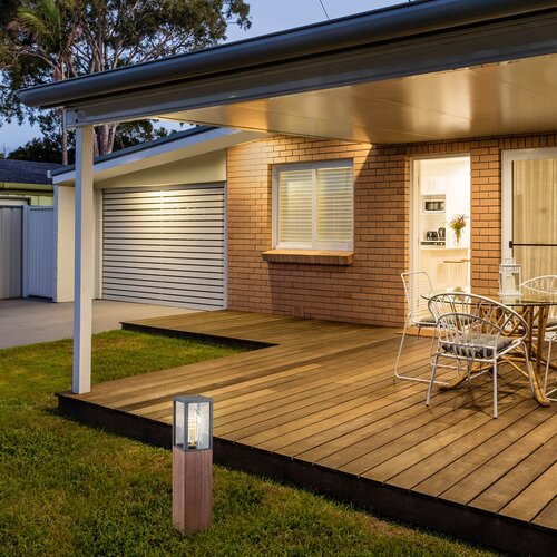 Sa svojim dizajnom sa drvenim uzorkom, spoljno svetlo u Velsu u modernom stilu savršeno se uklapa u prirodne boje vaše bašte. Providni stakleni abažur sa mat crnim okvirom postavljen je na prizmu sa drvenim uzorkom koja čini donji deo lampe. Uz pomoć Velsa možete efikasno osvetliti pešačku stazu koja vodi preko bašte ili možete staviti poseban naglasak na svoje omiljene biljke ili dodatne dekorativne elemente vaše bašte. Ovo baštensko svetlo može da se koristi sa jednom sijalicom snage do 60 V. Tip grla je E27. Spoljno svetlo ima širinu od 90 mm i visinu od 420 mm. Zaštita lampe IP44 obezbeđuje da je zaštićena od upada predmeta prečnika do 1 mm i od prskanja vode iz bilo kog smera. Vels spoljna podna lampa se isporučuje bez izvora svetlosti.