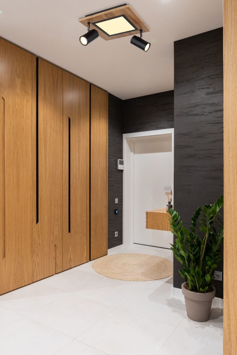 Ova sjajna plafonska lampa inspiriše svojim prelepim dizajnom. LED panel se nalazi na sredini kvadratnog drvenog panela (30x30x18cm) sa dva dodatna crno mat GU10 grla. LED panel obezbeđuje prijatno 3000 Kelvina toplo belo svetlo i ima 12W snagu. Funkcija memorije vam omogućava da zadržite poslednje korišćene postavke.