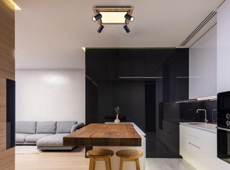 Ova sjajna plafonska lampa inspiriše svojim sjajnim dizajnom. LED panel se nalazi na sredini kvadratnog drvenog panela (45x45x13cm) sa još četiri GU10 grla u crno mat boji. LED panel obezbeđuje prijatno toplo belo svetlo od 3000 Kelvina i ima 24W snagu. Funkcija memorije vam omogućava da zadržite poslednje korišćene postavke.